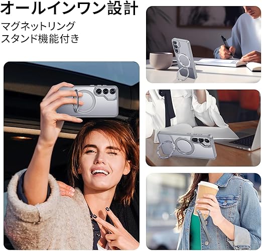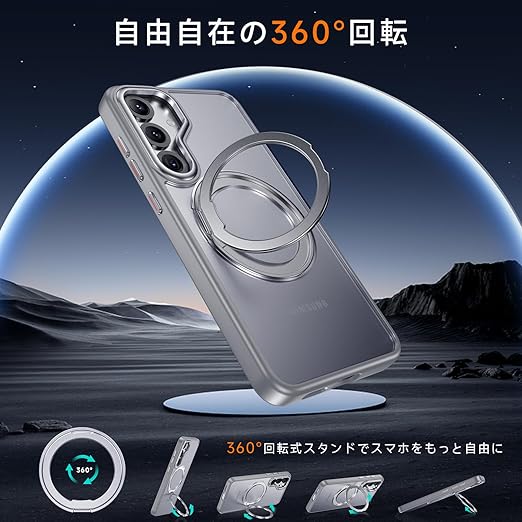 【米軍MIL規格・Magsafe対応】Galaxy S25 用 ケース MagSafe対応 リング 360°回転スタンド機能 縦横両対応 半透明 黄ばみ防止 ワイヤレス充電 レンズ保護 耐衝撃 携帯カバー ギャラクシー S25 カバー マグネット搭載 車載ホルダー マグセーフ対応 おしゃれ(グレー) a