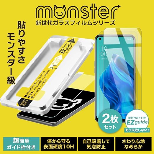 モンスターフィルム OPPO Reno5 A 用 | 強化 ガラスフィルム 透明 クリア 保護 フィルム 硬度10H | オッポ リノファイブ エー 対応 ベルモンド ガイド枠付き 2枚 セット B0797 a