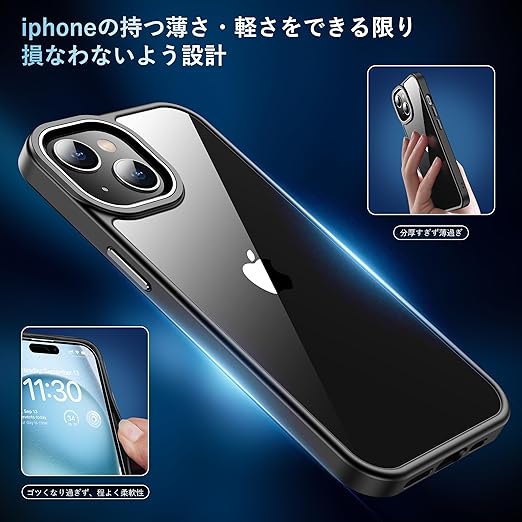 【高級感漂う・透明感抜群】 99.99%に持ち上げた透明感がiphone15の美しさをそのまま。厳選した高透明度、更に耐黄変に強い特殊なポリカーボネート素材を採用、指紋がつきにくい・黄ばんでなく正真正銘のクリア!本来の崇高な美しさと高級感を損なわなく、いつ