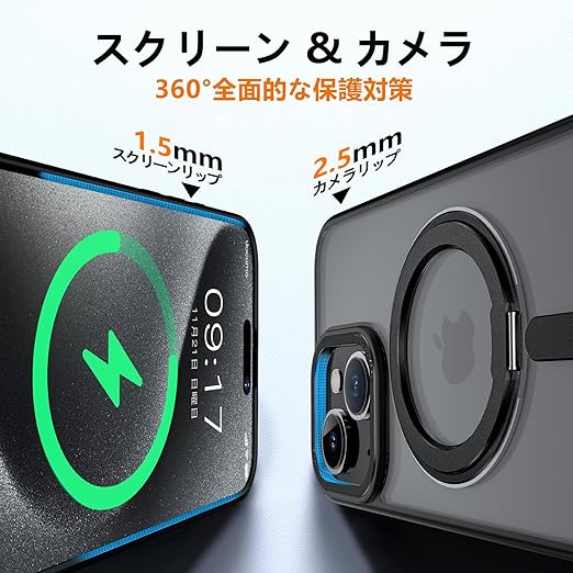KMAMBNG iPhone14 用 ケース 縦横両対応 リング 【多機能360度回転スタンド】MagSafe対応 ワイヤレス充電対応 半透明マット スマホケース 米軍規格 耐衝撃 カメラレンズ保護 車載ホルダー対応 6.1インチ いphone14用ケース (ブラック, iPhone 14) a