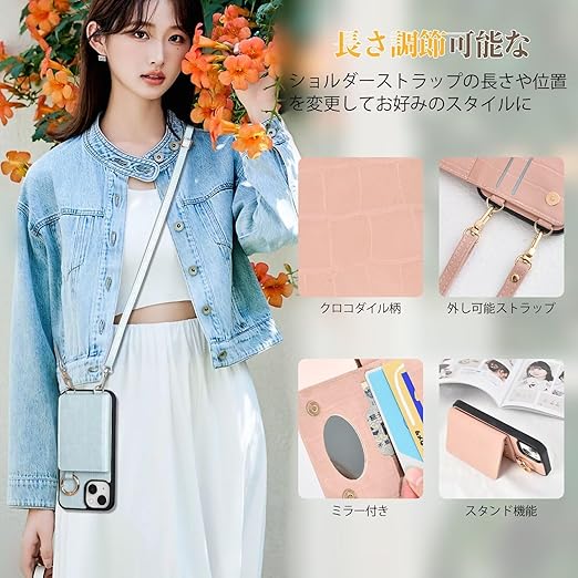 iPhone 15 手帳型 ケース ショルダー おしゃれ ワニ柄です スマホケース iPhone 15 手帳型 ショルダー 斜めがけ iPhone 15 手帳型ケース ショルダー 収納 ミラー付き 首かけ 女性 ストラップ 財布型 カバー アイフォン 15 携帯電話ケース レディース スマホケース ショルダー付きケース 小銭入れ 肩縄付き 調節可能な 横置き スタンド機能(ブラック) a