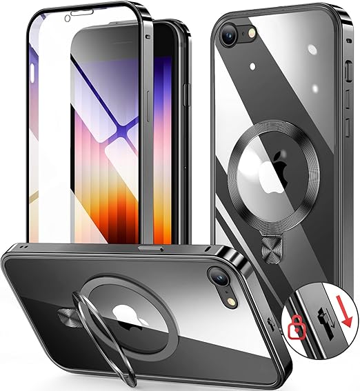 HGUTREY【スタンド機能付き・アクションボタン】 iPhone SE3 用 ケース 第3世代 2022 iPhone SE2 カバー 第2世代 クリア ロック付き【CDリング・MagSafe対応】 9H強化ガラス PC背面 両面 ストラップホール付き アルミバンパー メタルフレーム 高感度タッチ ワイヤレス充電対応 iPhone 第3世代 第2世代 用 ケース 4.7インチ(ブラック) a
