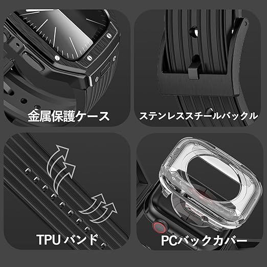 【高品質な素材】耐腐食性、耐摩耗性、耐酸性の高品質金属(Apple Watch保護ケース)とTPU(Apple Watch バンド)素材を採用、耐久性に優れています。また、精密な研磨技術と使いやすくファッショナブルな設計となっており、高級感あふれるApple Watchベルトとなっています。