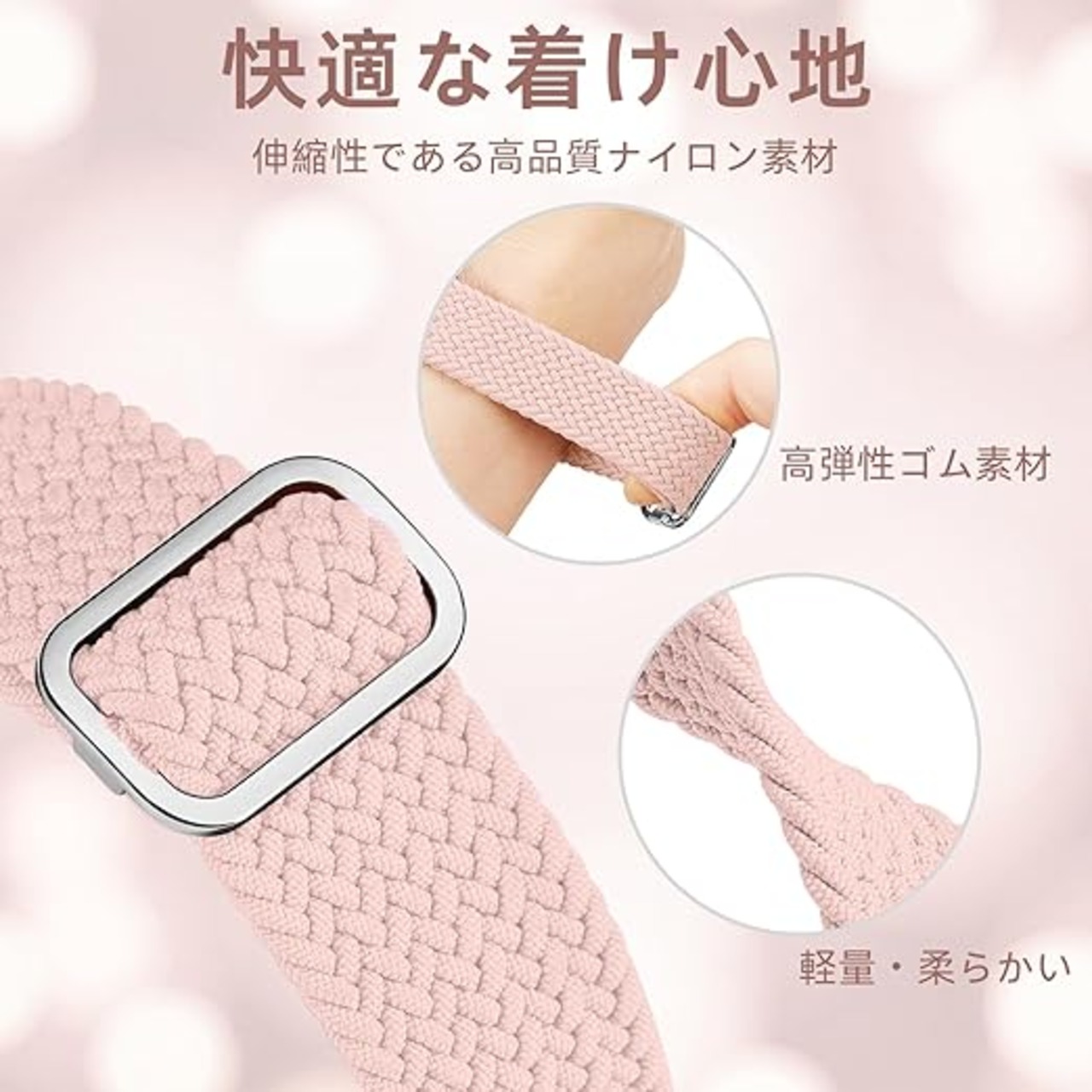 「対応機種&サイズ」当Missair アップルウォッチ ナイロン バンドとキラキラカバーの一体型セットは、iWatch Series 6 5 4 SEの40mm機種だけに対応します。iWatch本体の里側のパラメータに応じてサイズをご選択ください。伸縮性である設計で、115mm—228mmの手首サイズに適しています。長さは自由に調整可能です。