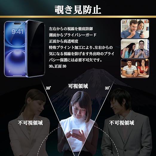 Huphuro【覗き見防止+ガイド枠付き】iPhone 16 ガラスフィルム のぞき見防止 プライバシー保護 日本製素材旭硝子製 硬度9H 耐衝撃 飛散防止 撥水撥油 指紋防止 スクラッチ防止 ガイド枠付き 気泡無し 簡単貼り付 アイフォン16 フィルム a