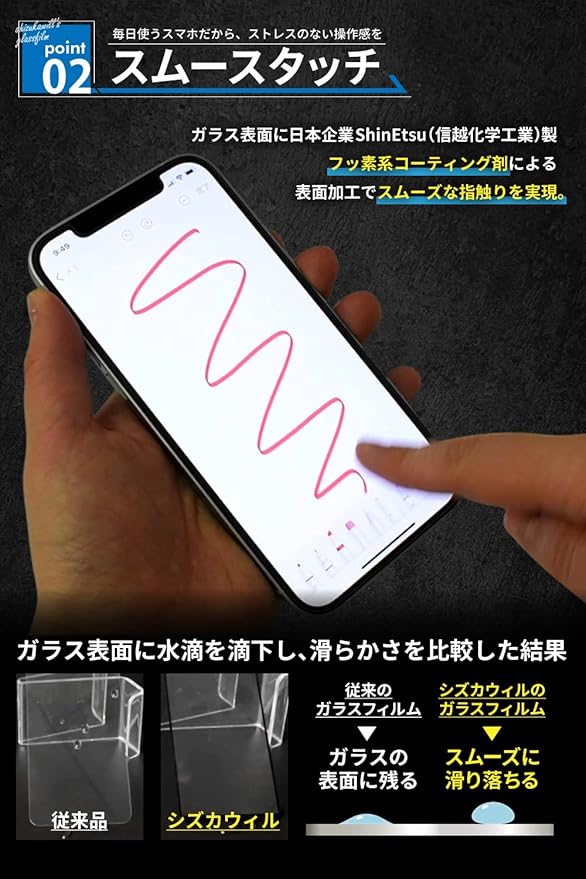 【滑らかな指触り】硝子[ガラス]の表面処理はフッ素コーティング[プラズマ溶射ツルツル加工]しており、フィルム表面を触