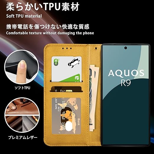 【適用機種】AQUOS R9 (SH-51E A401SH)専用ケース に対応なので。※購入前に対応機種をご確認よろしくお願い致します。外部のカバーは高級感が溢れるPU合皮を採用して、肌触りがよくて耐久性もよく、あらゆる方向からの衝撃、しっかりと本体を保護してくれます。TPU素材を採用、柔軟性が高く着脱が簡単で変形しにくく、ベタつかず適度な柔らかさで触り心地が良い。