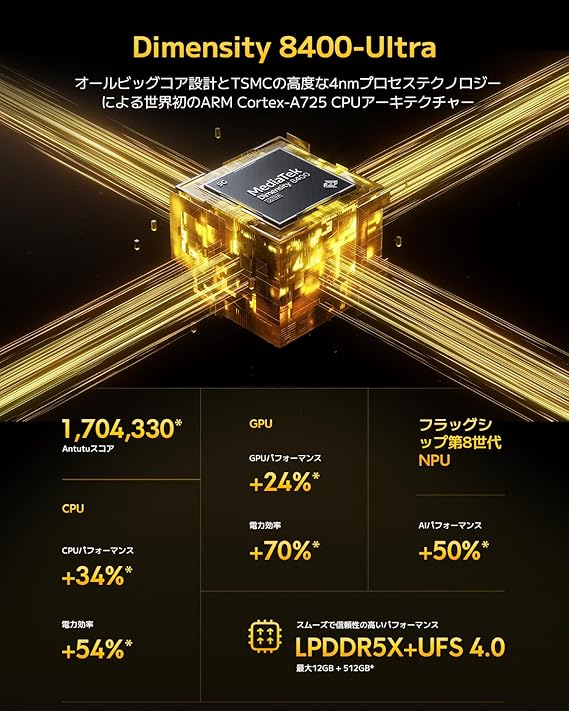 ハイエンド級のチップセット搭載。オールビッグコアCPUアーキテクチャ、フラッグシップレベルのGPU、業界最先端のAIエンジンを採用した最新のハイエンドチップMediaTek Dimensity 8400-Ultraを日本初搭載。