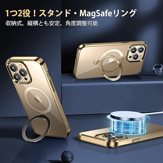 【CD MagSafeリング・スタンド一体】iPhone13 Pro Max 用クリアケース[MagSafe対応・隠しスタンド] [本体の色・メッキバンパー]ストラップホール付き 角度調整可 米軍MIL規格取得・耐衝撃 アイホン13 Pro Max透明ケース スマホケース13プロマックス人気6.7インチ(ゴールド) a