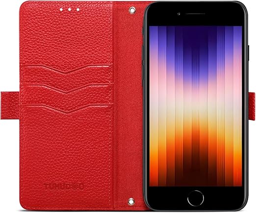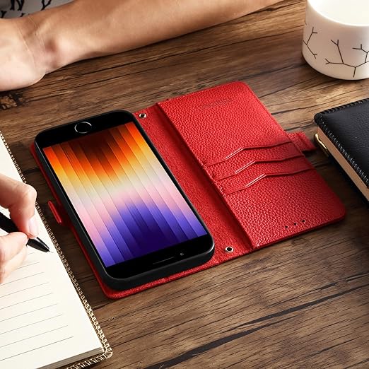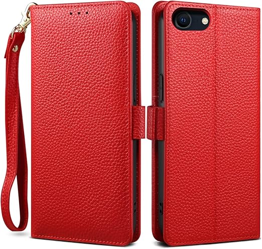 【 2023 新登場! 高級シュリンクカーフレザー】iPhone SE(第3世代)ケース iPhone SE(第2世代)ケース iPhone 8ケース 手帳型 本革 牛革 カード収納 サイドマグネット式 横置きスタンド機能付き 上下にストラップホール付き ストラップ付 柔軟なTPU素材 耐衝撃 全面保護[Noble Series](iPhone SE(第3、2世代)/8兼用、レッド) a