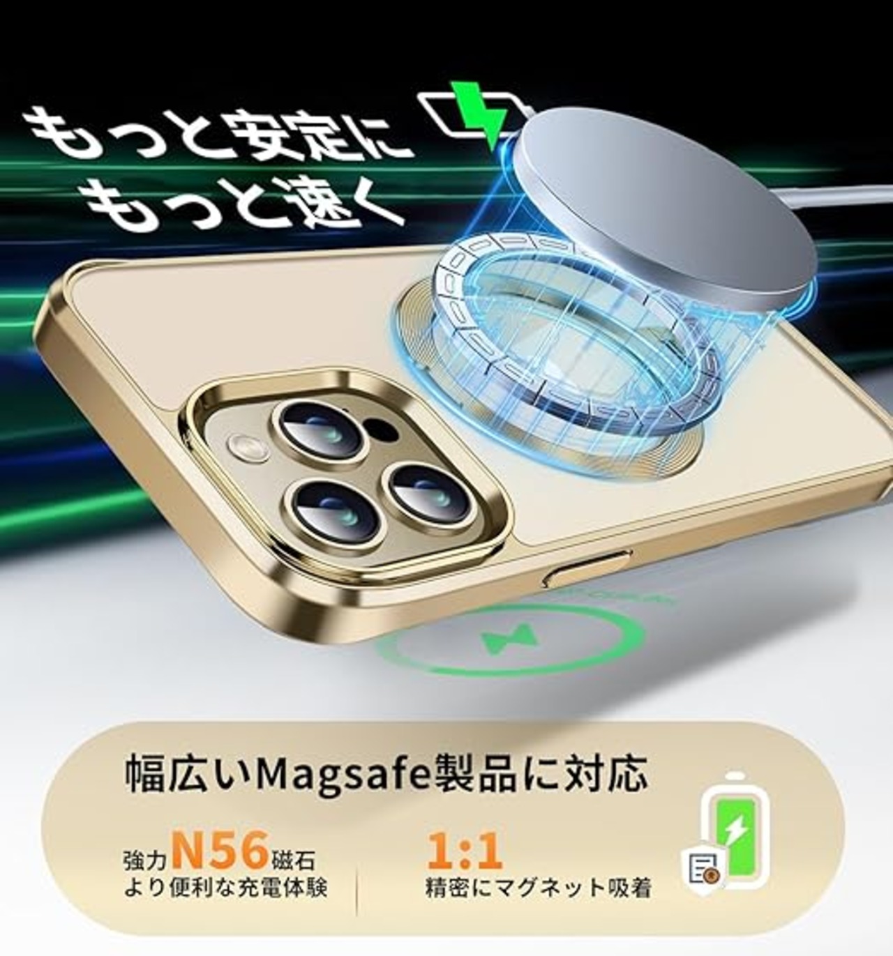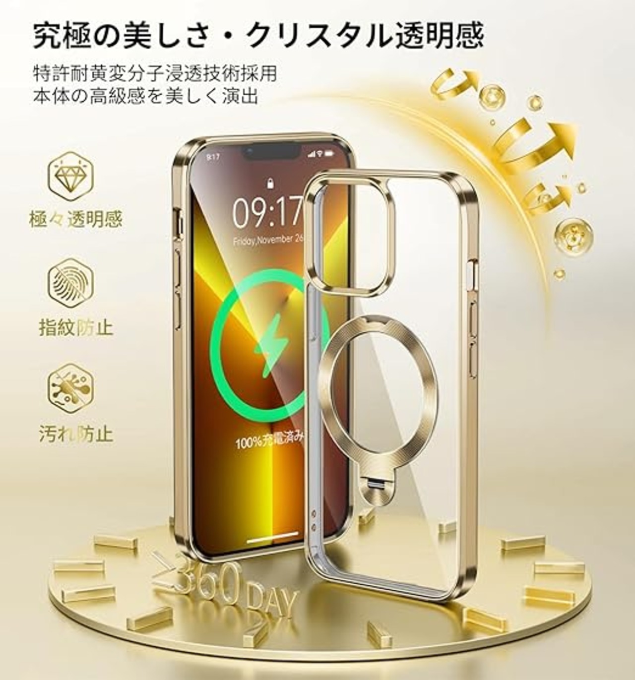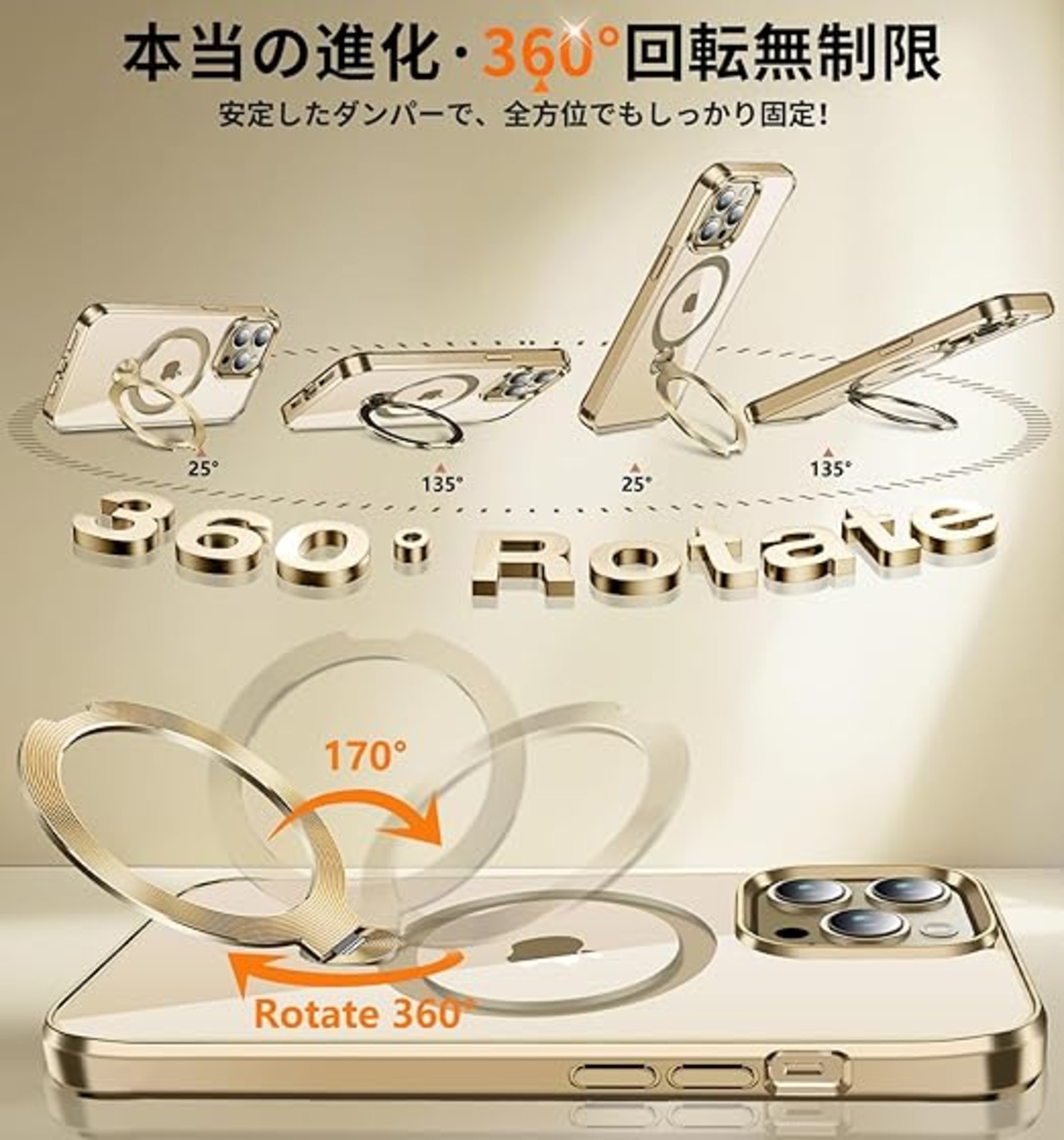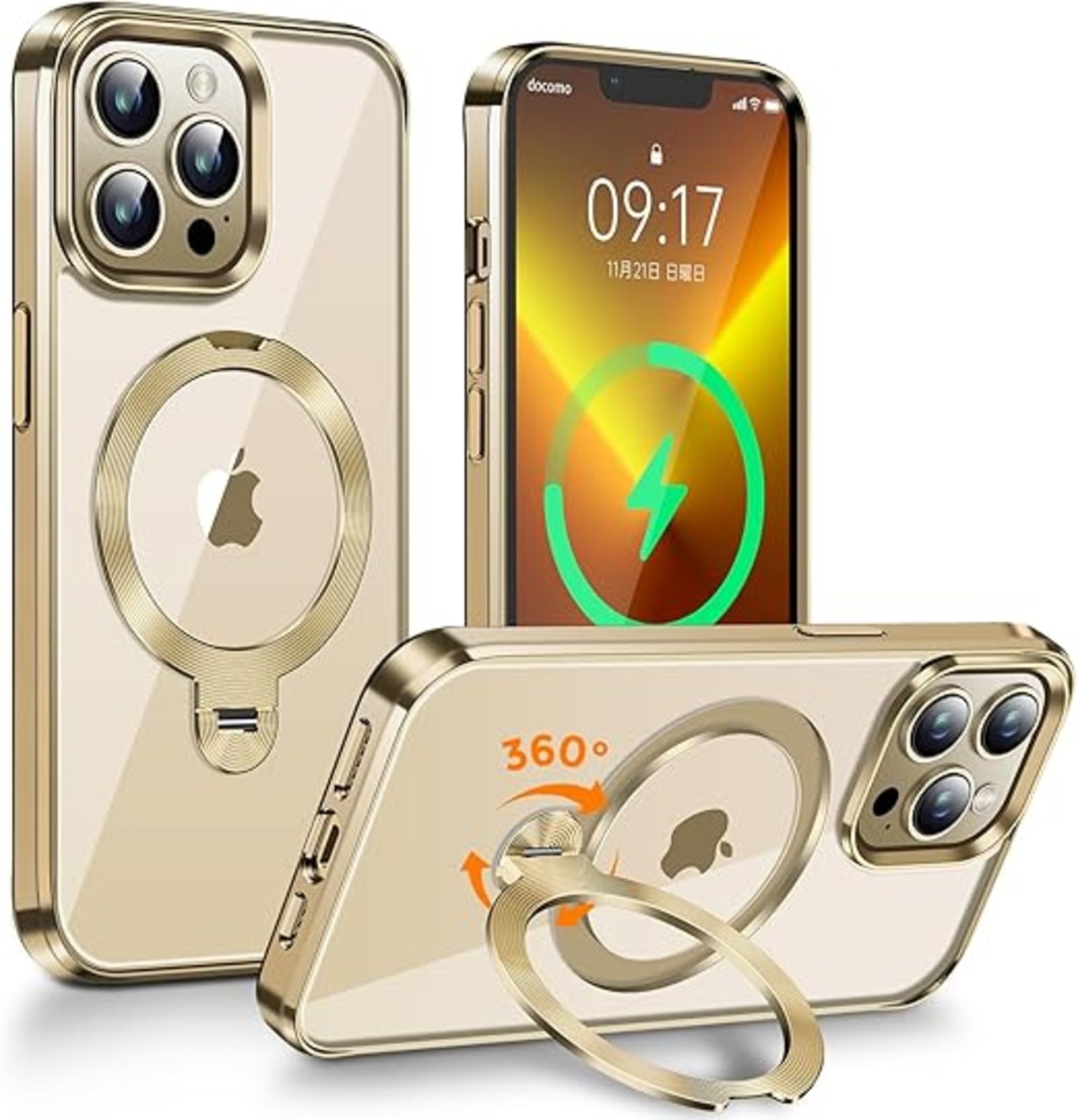 【360°回転無制限・縦横両対応】FONKCASE iPhone 13 Pro Max 用 ケース Magsafe対応【CDリング・スタンド一体】角度調整可能 ストラップホール付き【本体の色・メッキバンパー】アイフォン13プロマックス 用 カバー マグネット搭載 耐衝撃 高耐久性 透明 黄変防止 ワイヤレス充電対応 いphone13 Pro Max 用 ケース 6.7インチ(ゴールド) a