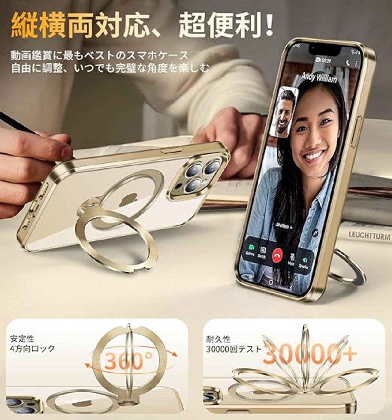 【本当の進化・360°定点回転神スタンド】このiPhone 13 Pro Maxケースは革新的な360度定点回転スタンドを採用し、縦置き・横置きどちらでも0°から170°まで自由に調整できます。iPhone 13 Pro Max専用設計で、ビデオ通話や映画鑑賞時に両手を完全に解放し、快適な使い心地を存分に与えます。このアイホン13プロマックスケースのヒンジは強化航空材料を使用して改良されており、耐久性と安定性に優れ、リングの緩みや破損のリスクを完全に解消しました。30,000回の耐久テストをクリ