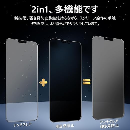 【2in1・多機能】 新技術を取り入れた2in1保護フィルムは、アンチグレア&覗き見防止機能を兼ね備えています。画面操作時の手触りをさらに改良し、より滑らかでサラサラな使い心地を実現しました。 【対応機種】 iPhone14 用(6.1インチ対応)。【パッケージ内容】 iPhone 14 ガラスフィルム * 1枚セット + iPhone14 カメラフィルム * 1枚セット + ガイド枠 * 1枚。