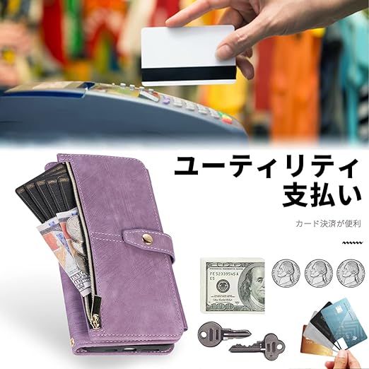 NKECXKJ iPhone 14 Pro 用 スマホケース アイフォン14Pro 肩掛け 首かけ 斜めがけ ショルダー PU革レザー iPhone14Pro 多機能 チャック付き 財布型 カバー いphone14pro 14pro アイフォン14プロ 手帳型 ケース カード収納 横置き スタンド機能 ?マグネットバックル付き 指紋防止 落下防止 薄耐衝撃 レディース メンズ(紫の) a