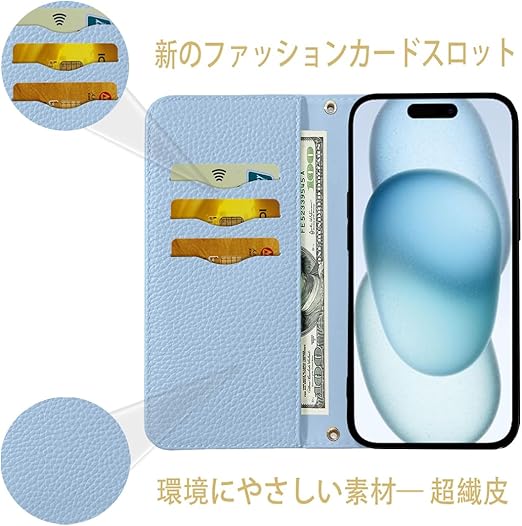 NanHou iPhone 15 ケース 手帳型 超繊皮 RFIDト 財布型 カバー 手帳型 耐衝撃 保護カバー 内蔵マグネット携帯カバー カードポケット スタンド機能 リストバンド iPhone15 - ライトブルー a