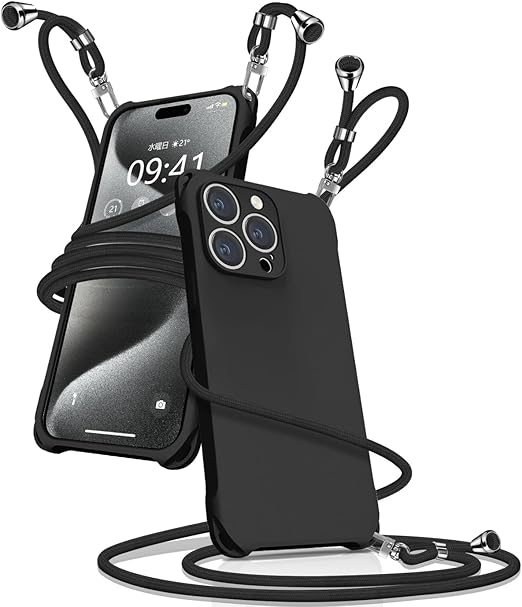 iPhone15 Pro Max ケース ショルダー シリコン iphone 15 Pro Max スマホケース アイフォン15Pro Max カバー 耐衝撃 肩掛け 斜めかけ 縄掛けケース 紐付き 斜めがけ 織りストラップ付き 長さ調整可能 取り外し可能 傷付き防止 マット質感 指紋防止(ブラック) a