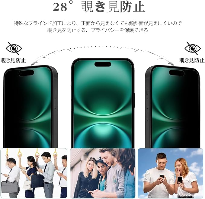★【対応機種】iPhone 16 plus(アイフォン 16 プラス)用。同梱物:28°覗き見防止強化ガラスフィルム2枚、レンズ保護フィルム 2枚 、ガイド枠1個 、取扱説明書。【品質保証】製品に初期の欠陥が見つかった場合は、注文履歴画面より出品者にご連絡いただき、お客様からのお問い合わせ内容に応じて代替品交換(一回無料で交換)・返金可能です。