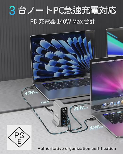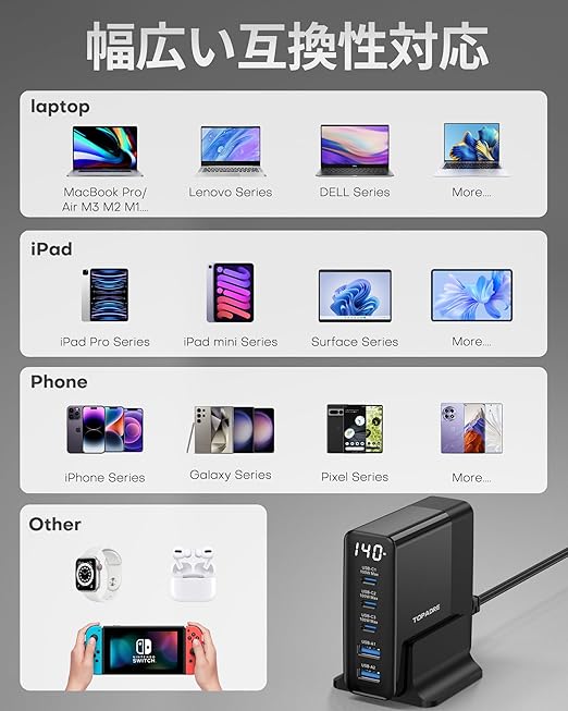 【5IN1 急速充電器・コンパクトデザイン・単ポート最大 100W】TOPADREはハイパワー AC アダプター 充電器の専門メーカーです;3つのUSB-Cポート(単一ポート充電最大100W)と2つのUSB-Aポート(単一ポート充電最大60W)を搭載し、ノートPC・タブレット・スマホ・イヤホン・スマートウォッチなど複数機器の同時急速充電が可能。合計140Wの高出力で、5台の機器を同時に超速充電することができます。一つのUSB タイプc 充電器コンセントだけで、usb コンセント占有やデスク周りの