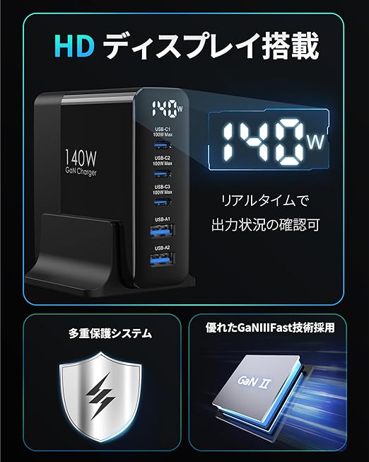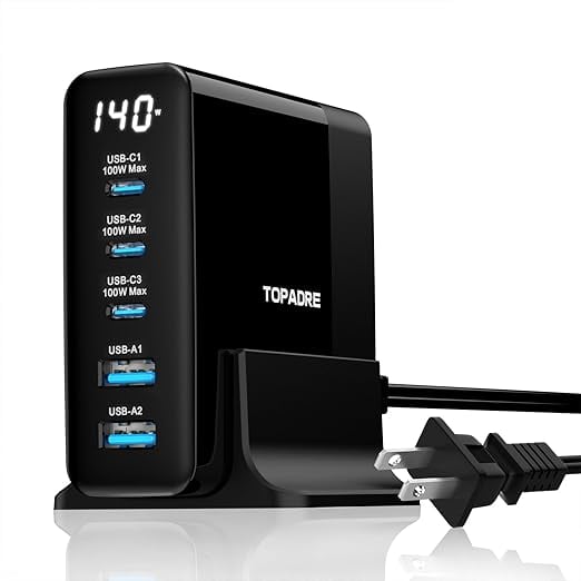 TOPADRE 140W 急速充電器 PD タイプ c 充電器【100W Max*USB-C*3+USB-A*2+ディスプレイ搭載+PSE認証】5ポート Type-c充 電器 MacBook M4 M3 /ipad Pro/iPhone 16/15/14/13 Pro Max/Samsung Galaxy Note各種デバイス対応 GaNIII(窒化ガリウム) 1.5mの電源ケーブル付き a