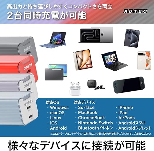 【65W PD急速充電器】20V時最大3.25A(65W)に対応し、 一般的なノートパソコンやスマホ、iPhoneなどの高速充電が可能です。またUSB-C 2ポート搭載し、2台同時充電にも対応致します。