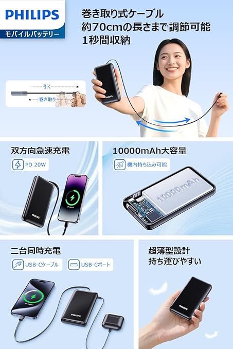 Philips (フィリップス) モバイルバッテリー 10000mAh大容量 巻き取り式USB-Cケーブル PD20W急速充電 出力入力対応 二台同時充電 パススルー充電 スマホ充電器 PSE認証済 多種保護 持ち運びやすい DLP1913C (ブラック) a