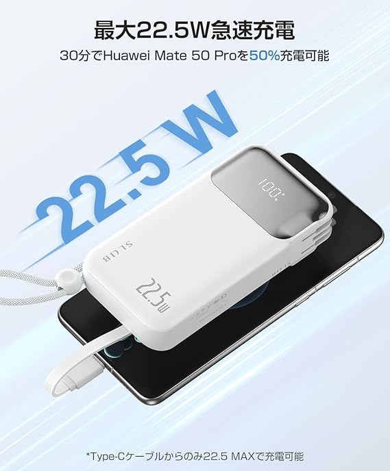 最大22.5W出力: モバイルバッテリーとしても急速充電器としても最大22.5W出力で、iPhone 16シリーズ等にも充電が可能です。