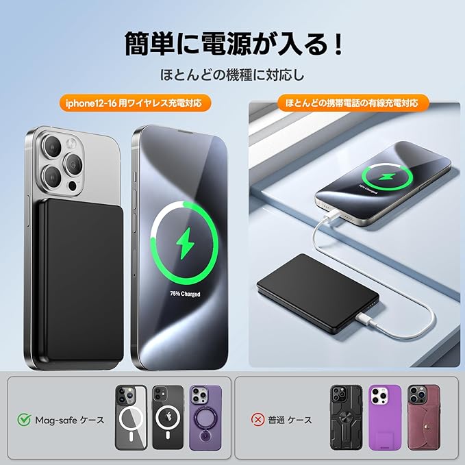 モバイルバッテリー 軽量 薄型:薄型 モバイルバッテリーはスリム化した 8.6mmの厚さ、110gの重量で充電器としても。スマートフォンにシームレスにフィットする、洗練されたポータブル充電オプションをお求めの方に最適なソリューションです。超スリムなデザインで、かさばることなく携帯電話に簡単に取り付けられ、携帯電話のレンズを干渉や傷から守ります。スタイル、利便性、効率性を兼ね備えたこの超薄型パワーバンクは、1日中接続とパワーアップを維持したい人にとって理想的なアクセサリーです。