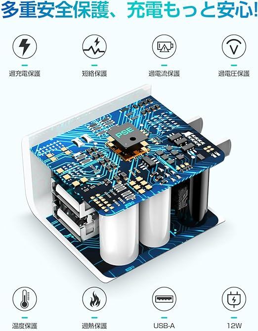 iPhone 充電器 USB 充電器 2ポート 12W ACアダプター 【MFi/PSE認証済み】 2M iPhone 充電ケーブル 2本付き 軽量 コンパクト USB 急速充電器 コンセント スマホ充電器 海外対応 iPad/iPhone/Android その他USB機器対応 a