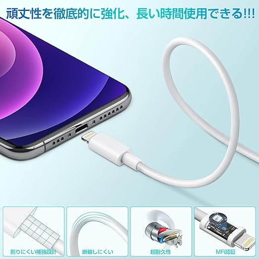 【ライトニングケーブル付き】:2M iPhone 充電用ケーブル2本付き、どこでもこれ1台、iPhone、iPad、Airpods、ワイヤレスイヤホン、モバイルバッテリーなどが充電できます。伝導率の良い銅芯を採用して、従来の5W充電器よ