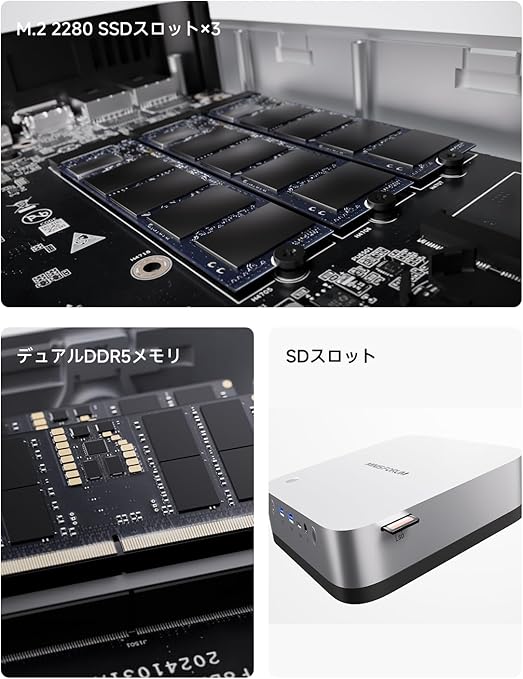 【AI ミニ PC】MINISFORUM X1 Pro 370ミニPCはAMD最新世代のZen 5アーキテクチャを採用した AMD Ryzen AI 9 HX 370 プロセッサーを搭載します。AMD Ryzen AI機能が可能になります 。総合的なプロセッサーのパフォーマンスは最大80 TOPSで、NPUのパフォーマンスは最大50 TOPSに達します。AMD Ryzen AIにより、生産性の向上、高度なコラボレーション、効率性の向上が実現します。それに、RDNA3.5アーキテクチャを採用したA