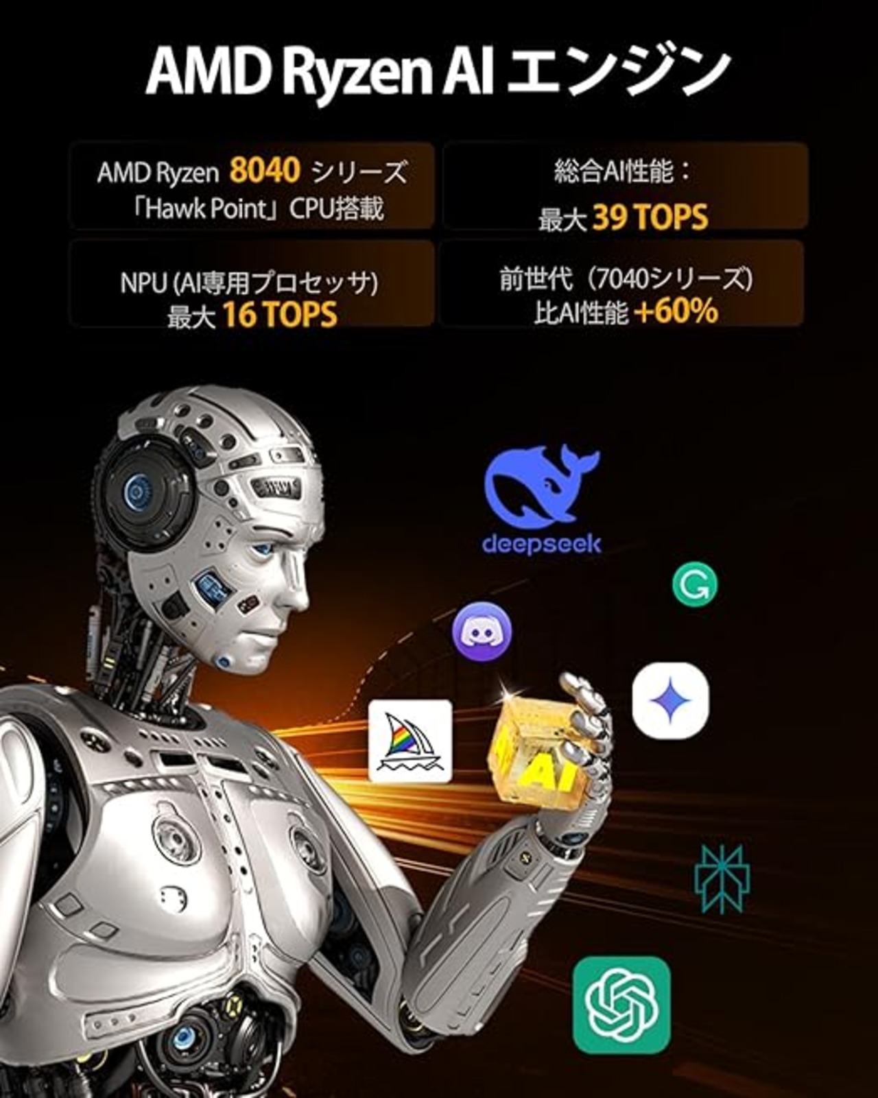 【AMD Ryzen 9 8945HS:圧倒的なパフォーマンス】8コア16スレッド、最大クロック周波数5.2GHzのプロセッサが、マルチタスクを高速かつスムーズに処理。 さらに、AMD Radeon 780M グラフィックス(最大2.8GHz、12基の