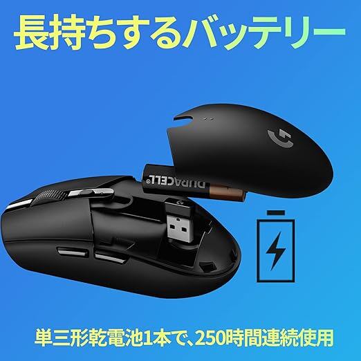 G304無線マウスは、単三電池1本で250時間という驚異的な連続使用可能時間を誇ります。ロジクールG HUBソフトウェアでエンデュランスモードに切り