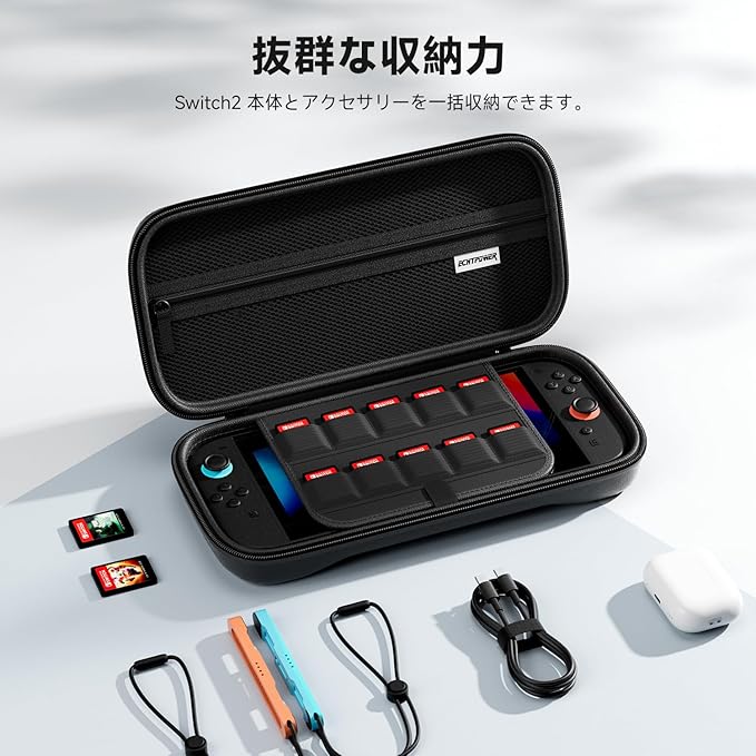 【抜群な収納力】Switch2本体に加え、Joy-Conストラッブ、USBケーブル、イヤホンなどの周辺アクセサリーをまとめて収納可能。さらにゲームカード専用スロット(最大10枚収納)を搭載し、必要なアイテムをコンパクトに整理できます。