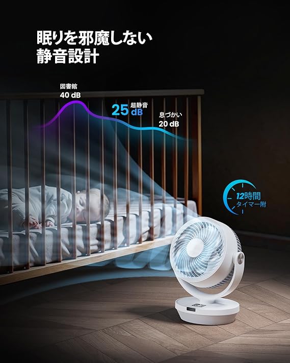 【空気の撹拌力UP!20mまでお届けるパワフル送風】PNTCK サーキュレーターは35W高出力のターボモーターが設置され、深傾斜角ブレードデザインとスライラル気流技術の相乗効果により、空気の撹拌力をアップさせ、圧倒的な送風性能を実現し、最大20mの送風距離で、部屋の隅々まで風を届けます。扇風機の優しい風と比べて、サーキュレーターの風は直線的で強い風を起こすため、換気や空気の循環に強くて、本製品は18畳までの部屋の空気循環に最適。