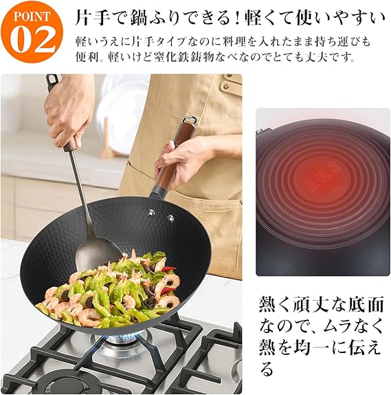 【中華鍋多機能】1鍋7役の万能性能 深さ9.5cmの実用設計で、炒め物からスープ煮込み、揚げ物まで対応。重量約1.3kgの軽量ボディで女性でも片手操作可能。木製ハンドルの耐熱グリップが滑り止め効果を発揮します。