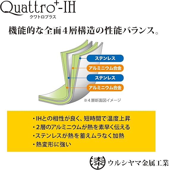 素材・材質:本体/4層クラッド材 (底厚2.0mm)・アルミニウム・ステンレス鋼・取っ手/フェノール樹脂、キャップ/ステンレス鋼、表面加工/(内面)ふっ素樹脂塗膜加工・(外面)研磨仕上げ