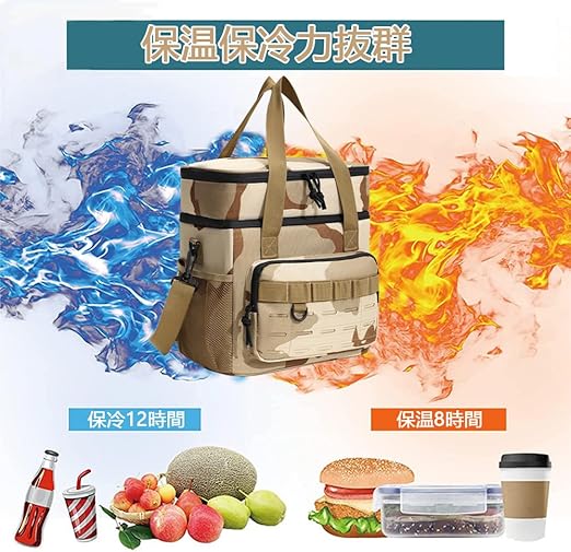 【デュアルレイヤーデザイン】: ソフトクーラーボックス、二重の分離したコンパートメントでデザインされています。温かいものと冷たいものを別々に保存できる。 容量は18リットル(上部コンパートメントが3リットル、下部コンパートメントが15リットル)前面、左右にポケットがあり、携帯電話、ティッシュ、充電器、水筒などを収納できる。フロントにはMOLLEデザインがあり、カラビナや鍵、サングラスなどをかけて収納便利です。