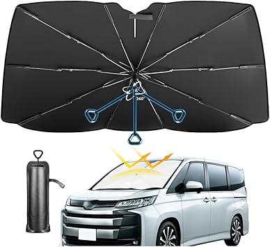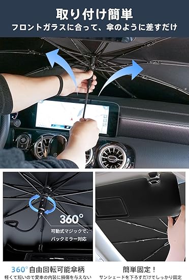 車用サンシェード 【2025 360°回転可能中棒】 サンシェード 車 フロント 日除け 傘 折り畳み式 UVカット 遮光 遮熱 収納便利 耐衝撃 フロントサンシェード カーシェード バックミラー開き口 強化10本骨 内装を傷つけない 露先が曲げ可能 取付簡単 収納ポーチ付き 軽自動車 車中泊 駐車 (全車種対応) a