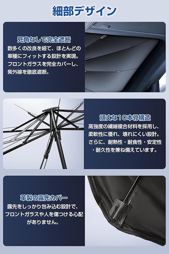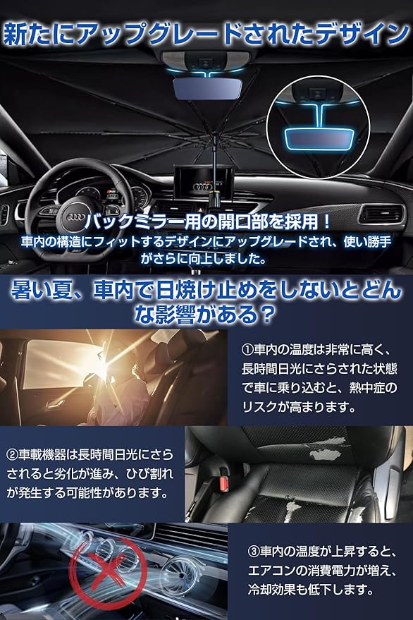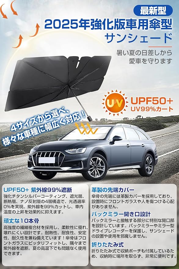 【2025最新強化版&暑さ対策】2025年夏の最新強化版カーサンシェード登場!暑い夏の日差しや長時間の駐車により、車内の温度は急上昇し、長時間日光にさらされた状態で車に乗ると、熱中症のリスクが高まります。また、車載機器も日光による劣化が進みやすくなります。これらの問題を防ぐため、車用サンシェードのご使用を強くおすすめします!本製品はアップグレードを重ね、光透過率0%を実現。されに紫外線を99%遮断し、車内の温度上昇を効果的に抑えます。