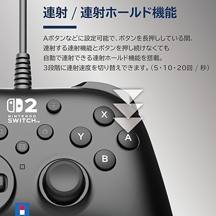 Aボタンなどに設定可能で、ボタンを長押ししている間、 連射する連射機能とボタンを押し続けなくても自動で連射できる連射ホールド機能を搭載。