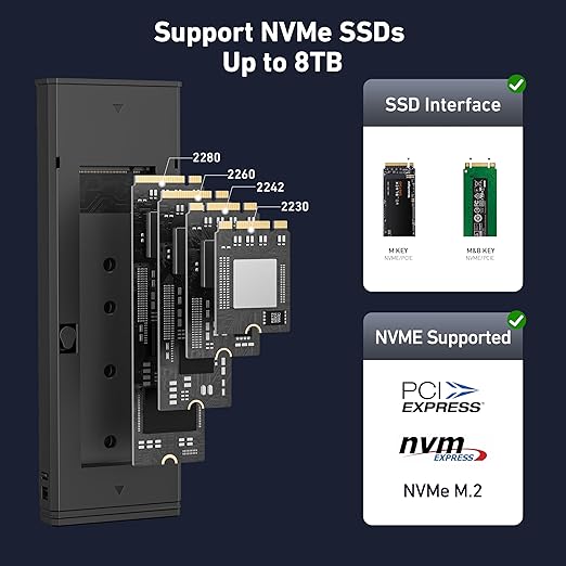 【10Gbps超高速転送】USB 3.2 Gen2対応のNVMe M.2エンクロージャ。2230/2242/2260/2280サイズのSSDを最大8TBまでサポート(SATA NGFF非対応)。