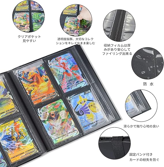 カードファイル カードバインダー シールファイル 4ポケット 160枚収納 表紙はPP素材 弾性包帯バインド カードシート他のゲームカードを集める (4ポケット, ブラック) a