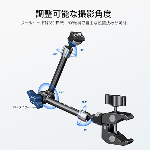 【スーパークランプ付き多関節マジックアーム】11"/28cmロゼットマジックアームクランプマウントは360°摩擦ギアジョイントで接続された2本の多関節アームを備え、DSLRカメラ、LEDビデオライトパネル、マイク、フィールドモニター(コンパチブル Atomos Ninja V)、スマホホルダー、アクションカメラアダプターなどの多彩な位置決めを提供します。スーパークランプは1/4 "と3/8"ARRI位置決め穴を介して、ロッド、ポール、テーブル、ケージ、ハンドル、三脚に接続します。最大荷重2kg