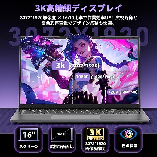 SERYUB Office 2024搭載ノートパソコン 16インチ 3K(3072×1920) インテル N150登場 (N100&N97より速い 4コア/4スレッド 最大3.6GHz パソコン 180°開閉可能 DDR4 16GB+NVME SSD 512GB ノートPC Windows11対応 RJ45/USB 3.0/TYPE-C 学生&初心者向け a