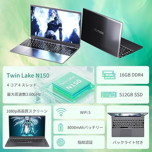 ノートパソコン MS 2019搭載「Twin Lake N150 15.6インチ 4コア/4スレッド 8000mAh大容量バッテリー DDR4 16GB 512GB M.2 SSD 最大周波数3.60GHz 軽量 ノートPC」 Win11 Pro/指紋認証/BT5/Wi-Fi5/USB3.0*2/日本語キーボードカバー付き ノートPC シルバー a