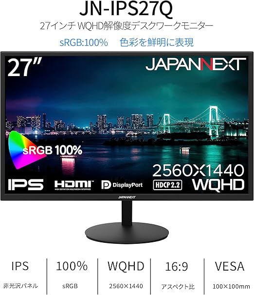 【ECサイト限定】JAPANNEXT 27インチ IPSパネル搭載 WQHD(2560x1440)解像度 液晶モニター JN-IPS27Q HDMI DP sRGB:100% 【2年保証】 a