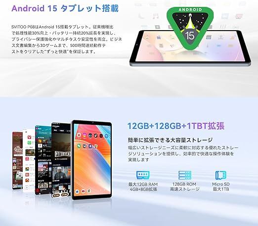 【最新Android 15タブレット+8.7インチ+7.6mm薄型+軽量359g】 P08 タブレットは最新Android 15 OSを搭載し、よりスムーズな操作体験と高速なアプリケーション起動を実現します。アクセシビリティ機能の拡張及びデータプライバシー保護機能を強化しています。耐久性に優れたメタルボディを採用したAndroid 15タブレットは、8.7インチの黄金サイズ(厚さ7.6mm/重量359g)を採用、コンパクトで軽量なデザインにより片手での保持が容易です。日本市場向けに最適化され