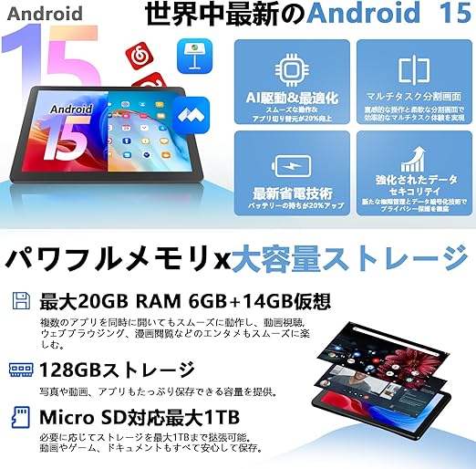 【Android 15 タブレット10.1インチ初登場】COOPERS CP31 10.1インチ タブレットは最新Android15 OSを搭載し、64ビットAPPアプリケーションに深く最適化され、起動と応答速度が向上しています。 また、弊社の二次開発では、システムUIの一部が改善・最適化され、より多くのサードパーティ製アプリケーションに適応し、システムインタラクションがよりフレンドリーで便利になりました。プライベートスペース:機密性の高いアプリやデータを見えないようにします。アプリのペア:最も