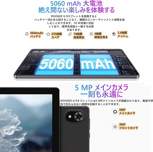 【10インチ Android15 初登場】Android 15 タブレット、7GB+64GB+1TB TF拡張、 Widevine L1+GMS認証+Type-C充電+5060mAh、DOOGEE U9 10インチ wi-fiモデル、アンドロイド タブレット 1280*800 IPS画面 8コアCPU、5GWiFi+BT5.0+OTG+3D重力センシング+無線投影+日本語説明書 a