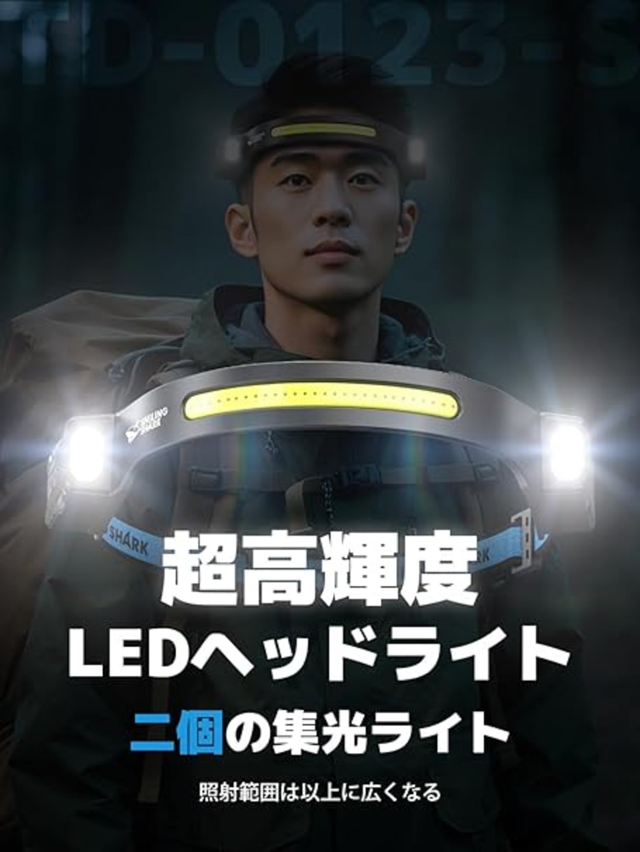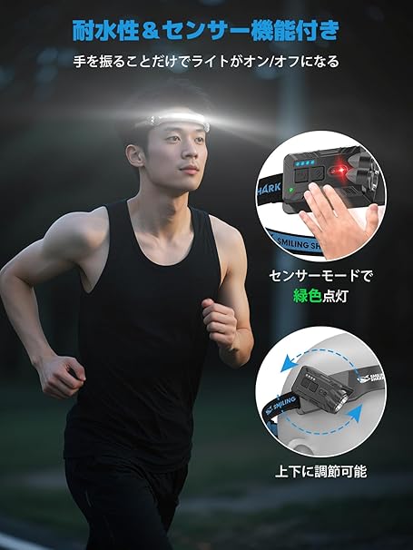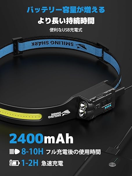 Smiling Shark ヘッドライト TD-0123-S 【2つの集光ライト・幅広い照射範囲】Type-C充電式 高輝度 LEDヘッドランプ 強力 5つ照明モード 点滅 270°以上広角照明 人感センサー付き 8時間連続使用可能 IPX4 防水防塵 多機能 釣り 登山 散歩 キャンプ 作業 災害 停電 最適 一個入り a